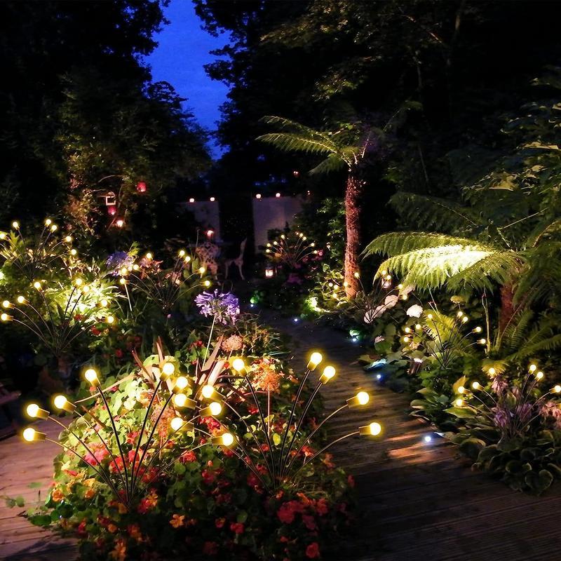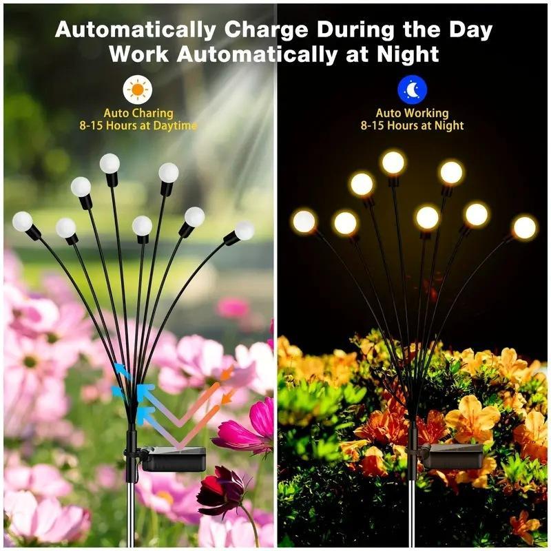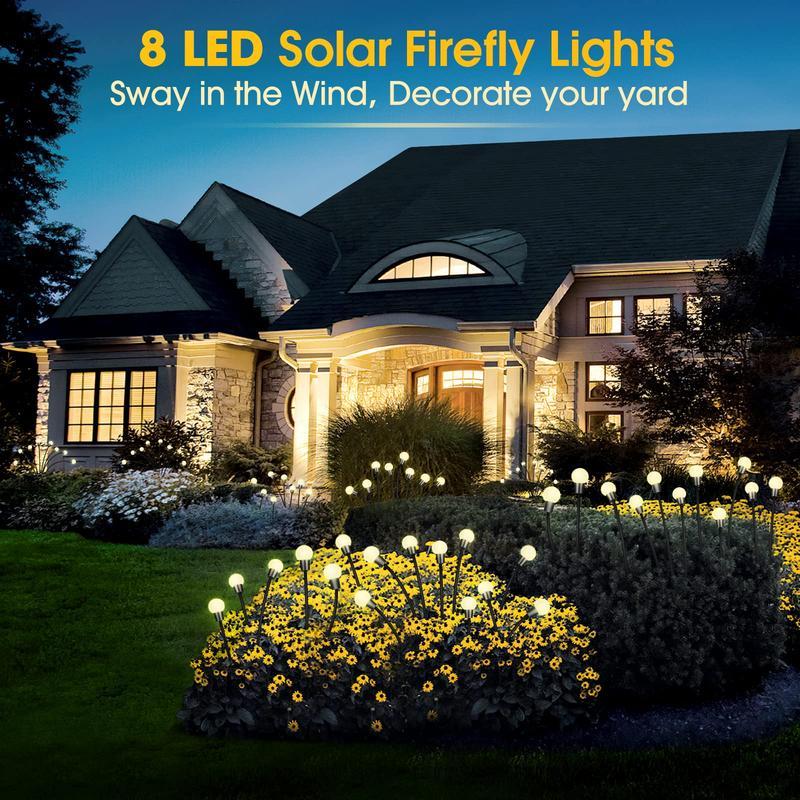 The solar garden lights are upgraded in 2024 with bettersolar panel and larger capacity batteries. The meterial ofthe strands and spikes are stronger and durable. The firefly lihghts will dance like vivid fireflies in the garden whenwind blows. Bring you a unique feeling. Each cluster oflights has 8 LEDS.
